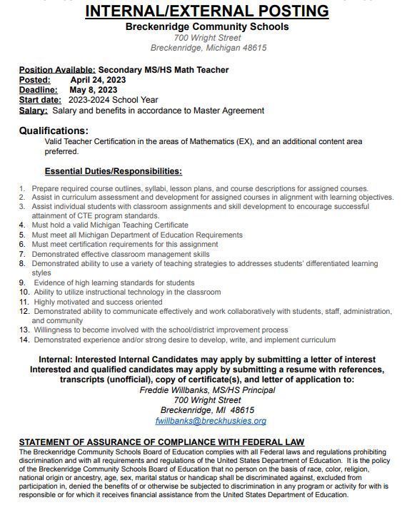 Breckenridge Community Schools is looking for a MS/HS PE Teacher. Find more information in the posting below or with this link https://5il.co/2iuco.